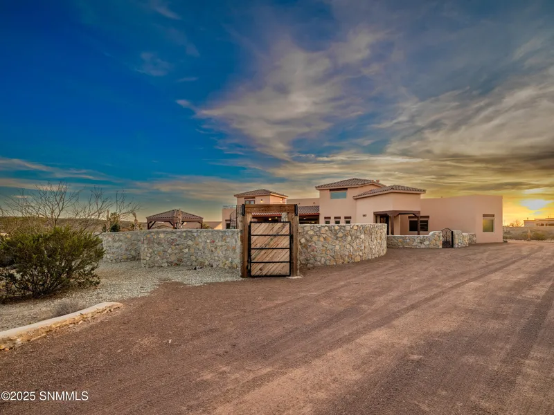 Unreveal this exceptional custom home, built in 2018, located in the desirable gated community in Tierra Escondida. Spanning 3,062 sq. ft. on over 1.5 acres, it offers stunning 360-degree views of Las Cruces, including the majestic Organ Mountains. The open floor plan features high ceilings with wood beams, creating a warm and spacious atmosphere. The kitchen is a highlight, offering panoramic mountain views that enhance every meal. It flows seamlessly into the living and dining areas, perfect for both entertaining and everyday living. With 3 bedrooms and 3.5 bathrooms, the home provides ample space. Upstairs, an extra room with 360-degree views and a half bath offers endless possibilities. Enjoy outdoor living with a heated pool, cascading waterfall, and a convenient poolside bathroom. The oversized three-car garage offers plenty of storage, and the expansive lot invites you to soak in the natural beauty. Residents also have access to amenities like tennis courts and a playground.