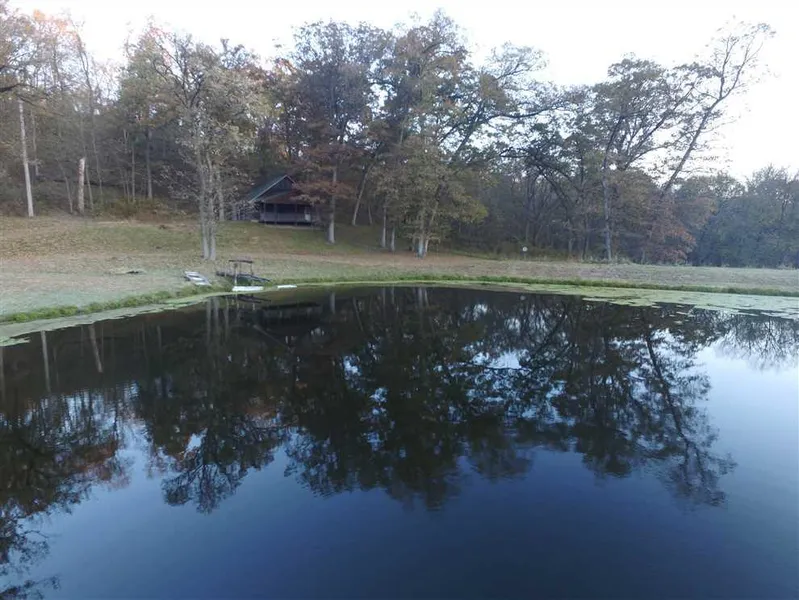 As you follow the driveway past the shop it starts to switchback down the hill and turns into the timber. Following the gravel rd down it ends at the bottom of a big deep ravine in a park like setting with a big beautiful pond surrounded by steep oak covered hillsides and a cabin overlooking the pond. The seller says the pond is 17 ft deep and loaded with big fat crappie several up to 17 inches or better. After harvesting your families limit of turkeys on a crisp April morning, you can sit on the cabin porch and listen to the turkeys gobbling out in the corn fields as you prepare to go catch a mess of crappie. Spend the late morning picking up enough fresh morel's that you can cook an incredible lunch for the family with the spring trifecta.