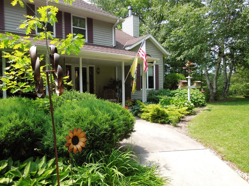 Thoughtfully planned and a graciously elegant home and property! Kitchen with 11 x 17 dining area and large kitchen island has french patio doors leading to deck. New kitchen, hallway and laundry Cortec flooring in 2020. Six panel interior doors. Option for fireplace in basement and plumbed for bathroom. Living room and foyer with soaring cathedral ceilings. Sun room features wall of windows and access to deck. First floor master suite. Bedrooms on second floor plumbed for baths. Unfinished walkout basement with lower deck. Gorgeous and private wooded acreage. Pool table included. Large 40 x 100 outbuilding/workshop.
