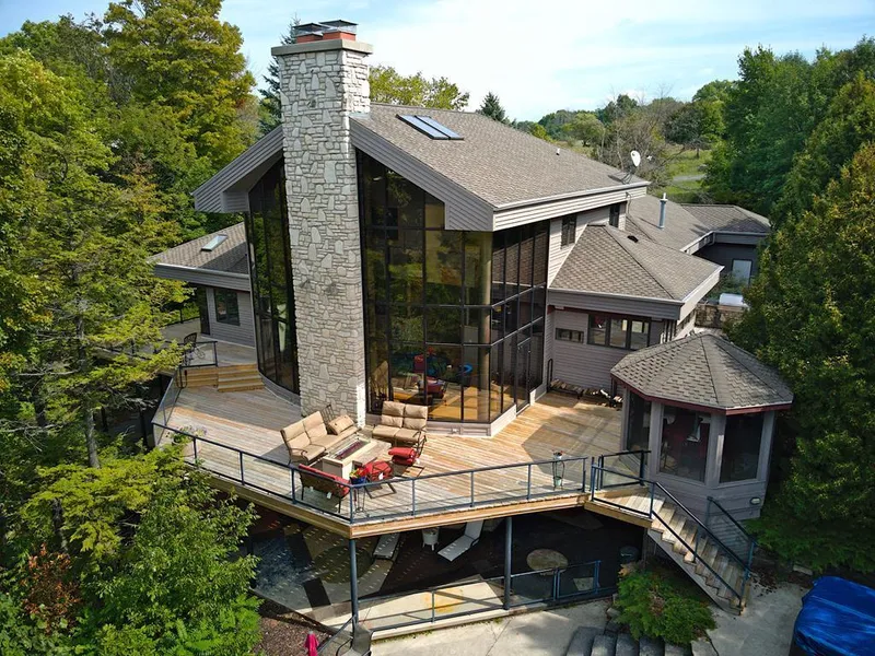Spectacular contemporary home on the bluff just 2 miles from Egg Harbor. The house is a work of art and features towering ceilings, slate floors, huge kitchen, living area with bar, fireplace, lower level rec area, kids play room, first floor master suite, 3 guest bedrooms, and office. Outside there are multiple decks, gazebo, in ground pool, hot tub and an amazing view of the waters of Green Bay, Michigan, and explosive Door County sunsets. HOA fee is paid annually. Room sizes are averages due to irregular shapes.