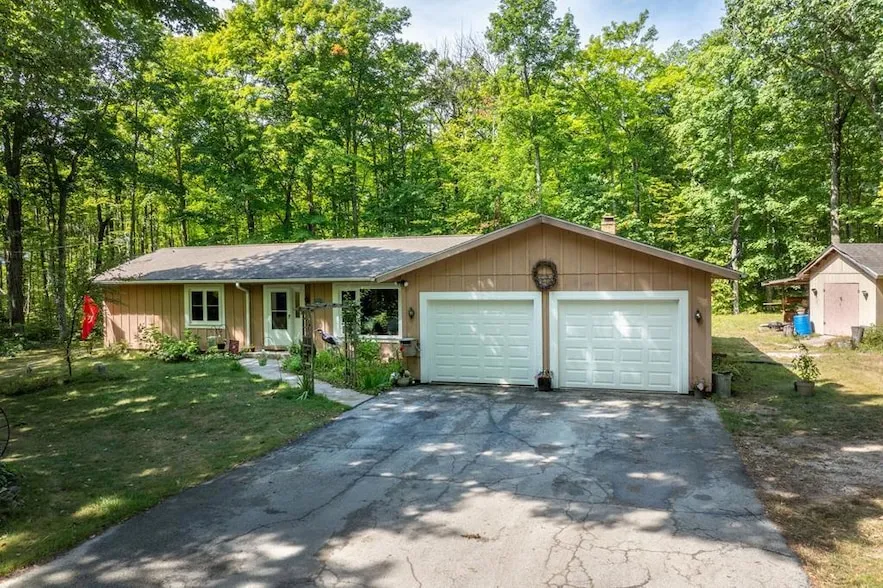 Charming woodland retreat! Nestled in the heart of nature, yet just a short drive to Sister Bay or Ellison Bay, this 2 bedroom 2 1/2 bath home offers recently updated quartz and granite kitchen countertops, appliances, windows, garage doors, paver patio, and luxury vinyl flooring throughout. Curl up next to the wood burning fireplace or sit outside and enjoy your morning coffee amongst the mature trees and peaceful wildlife. This cozy retreat is perfect for those seeking tranquility. Commercial FDA approved kitchen in garage. Commercial equipment sold separately. Successful pizza delivery business for sale also, ask for more info.