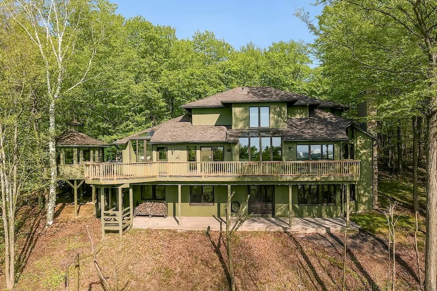 Best sunset views in Door County! Spectacular panoramic bluff setting just north of Egg Harbor above White Cliff Rd with large deck and screened gazebo to soak in those westerly water views! Impressive three level home w/ TWO stone fireplaces and a main floor primary suite. 4 full bathrooms and 3 bedrooms offer ample space for your primary or secondary home. This home sits very privately among the other luxury properties at the very top of Island View Rd. The 1.7+ acre lot extends past the bluff allowing full control over tree topping and view control. Walk out lower level designed for entertaining. 3-car heated garage, central AC, and generator. Built in the late 80s, this property is a rare find due its near perfect condition. Some photos are virtually staged.