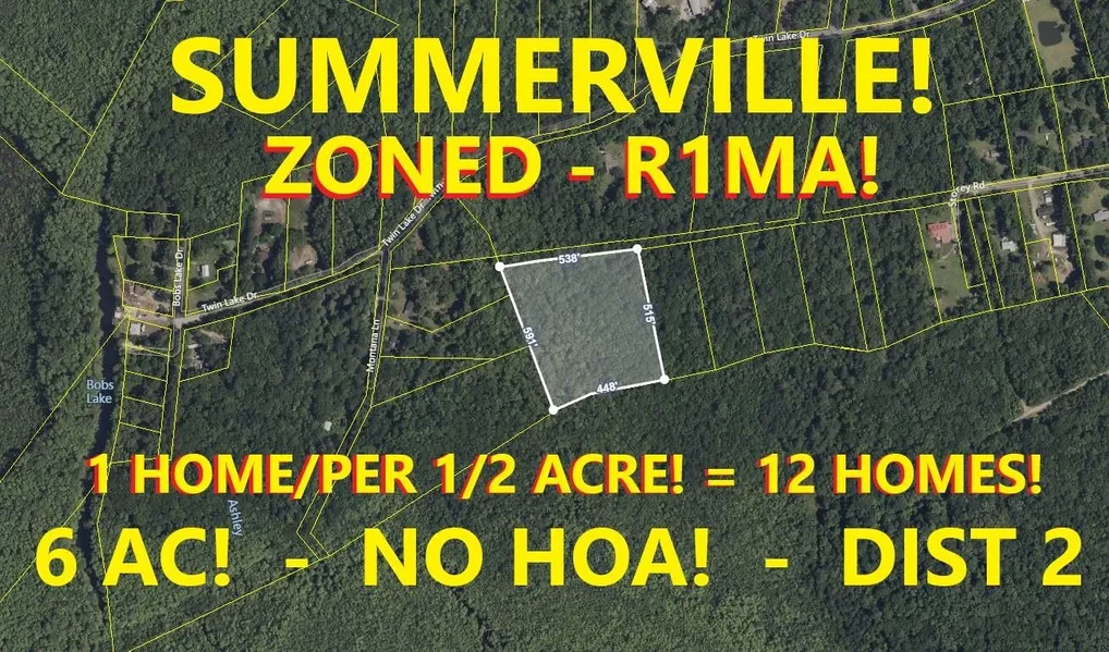 ***ATTENTION!!** -- 6 FULL ACRES!! ***ATTENTION!!** -- ONLY 85K!!! **(SELLER MOTIVATED! - LOOKING FOR OFFERS!) **R1MA ZONING!! (Allows 1 home or manufactured homes per 1/2 Acre! = 12 homes for the 6 acres!!) ---- (or *12 FULL ACRES!! See below) -- SUMMERVILLE - DISTRICT II SCHOOLS!! ****UNDER 110K!!**** NO HOA!! -- Just minutes to all shopping, restaurants, schools, parks, and hospitals, that Summerville has to offer! (Survey complete and in Documents) - We are told the adjacent neighbor has sewer hook-ups. - Flood Zone AE - This is RAW land, all Due Diligence must be done by the buyer. ---- ADDITIONAL ADJACENT 6 ACRES ALSO AVAILABLE! See MLS# 24030887 **SEE MORE.... Property is in a flood zone, Please Do your Due Diligence prior to submitting offers.****PLEASE NOTE! - No studies have been done - ALL the information we have been able to obtain from the sellers, and any/all third-party organizations, including but not limited to city/county and other entities, has been posted to this MLS (under "Documents"). If you do not see the item in question (Plat, Survey, Wetlands JD's, Elevation Cert, Etc., it is because we do NOT have them. -- Unless specifically noted, these items in question, will be the buyer's responsibility, either during the DD period or post-closing. Thank you.