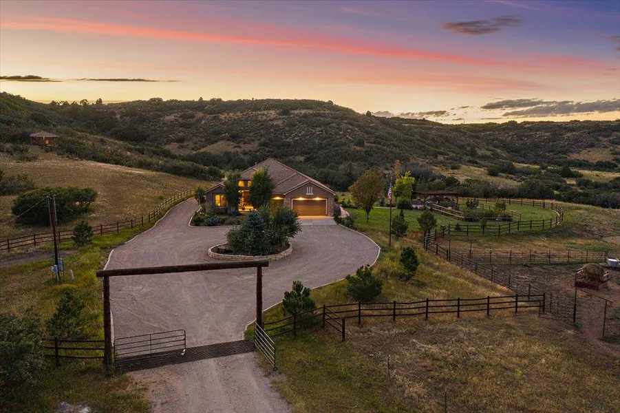 Situated on over 57 acres and offering wide open spaces, this stunning equestrian property is the perfect place to call home. Privately set amidst bluffs and mature landscaping, and bordering Castle Rock and Douglas County Open Space on one side and Hidden Mesa Trail and Open Space on another, this estate offers seclusion yet is just minutes from town. Ride your horses directly from the property to Hidden Mesa Trail's 1100 acres. Enjoy 6400 finished square feet in the thoughtfully updated home. The grand foyer opens to the main level with floor to ceiling, west facing windows blurring the boundaries between inside and out. Updated gourmet chefs kitchen with Viking appliance package and Sub Zero built in refrigerator/freezer, chiseled granite countertops, copper tile backsplash, steamer oven, dutch door convection oven and warming drawer. The large kitchen island features Sub Zero built in refrigerator drawers and a gas cooktop. The breakfast nook, featuring a large bay window, is adjacent to kitchen. The kitchen opens to the formal dining space and great room with stone surround gas fireplace and built-in entertainment center. Expansive primary suite boasts walls of windows and back patio door. Spa-like primary bath offers dual sinks and separate vanity area, large jetted soaking tub and dual head shower with custom tile and benches. Spacious walk-in closet with built- ins and shelving complete the primary bedroom. Main floor secondary bedroom with en suite full bathroom and large walk-in closet. Office including a built-in technology center and a wet bar featuring Viking appliance package and ice maker complete the main level. Fully finished lower level includes the recreation room with included pool table and bar and separate playroom. Enjoy the movie theater with coffered ceilings, included projector and screen. Two additional lower level bedrooms and two full baths, wine cellar with humidifier and storage space. Convenient two and a half car garage with new concrete driveway. Front porch and covered back patio with sun shades. Expansive grounds and outdoor living spaces include the upper gazebo with electricity and offering incredible wraparound views of the Cherry Creek Valley. Relax in the outdoor lounge including a wood burning fireplace, built-in gas grill and trellis. Unwind by the private pond complete with lily pads and stocked full of Bass and Blue Gill. Huge 40x42 workshop with 240v power, heat and central air, and full adjacent bathroom and washroom with water heater. Morton Buildings 60x96 barn built in 2017 offering 240v power, four horse stalls with outside runs and horse pasture. Climate controlled fodder system that can produce 5000 pounds per day, year round, of green grass to feed horses and livestock or to produce income. Additional outbuildings include the chicken coop, two lean-tos and 13x30 tack shed. Beautifully setup to run all animals and ride horses directly to adjacent open space trails. Incredibly rare opportunity to own this immaculate ranch and all it has to offer, while conveniently located close to main thoroughfares, shopping, schools and restaurants.