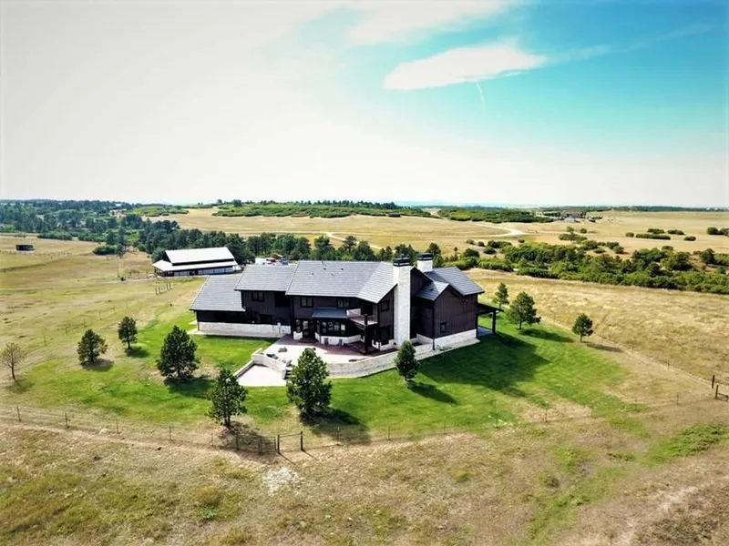This beautiful 5,600 sq. ft., 6-bed, 6-bath custom home sits on 36 rolling acres in Larkspur, Colorado. With a 4-car garage and a 4 stall barn with additional parking spaces and storage; this artfully designed home features not just space - but an abundance of character with reclaimed wood flooring and beams. Exquisite detail in the woodwork, flooring, and design. This equestrian property is a short commute to both Colorado Springs and Denver. Easy access to shopping, restaurants, and outdoor destinations of the Front Range. The exterior is appointed with Texas Limestone, repurposed beams, and tile roof. There is a stamped concrete parking pad in front of the garage which leads to the covered front entry and wraps around to a covered patio with views across the meadow to the west. In the back, massive boulders are integrated into the design - creating an ideal outdoor gathering space. In...