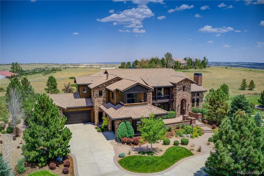 Step into this gorgeous custom built 5-bedroom, 7 bath home in Pradera. Designed to enjoy the Colorado lifestyle from every room. Take in the mountain views from the spacious courtyard and Master Suite balcony. Floor to ceiling wood windows throughout the main floor. No detail has been overlooked to make this luxury home feel open and welcoming. Entertaining is simple in this updated chef's kitchen featuring endless storage options, abundant workspace, two subzero refrigerators, and designer appliances. The kitchen has been updated with quartz countertop, farmhouse sink, back splash instant hot water and RO system. Enjoy evenings cooking in your outdoor kitchen complete with BBQ grill, fireplace, hot tub, and perfectly landscaped yard. Retreat to this stunning master suite featuring vaulted ceilings, fireplace, coffee nook, luxurious bathroom, his and hers professionally finished walk-in closets and chandelier. Spacious secondary bedrooms have walk in closets and attached baths. Handsome paneled study on main floor with access to back yard. This home has been upgraded throughout with hickory floors, in-lay tile, custom high-end light fixtures and recessed lighting, new furnaces, new water heaters, dishwashers, exterior stucco and stain Control4 has been added to great room and basement entertainment area. Also controls music throughout home where speakers are built in The finished basement, designed to provide a separate living space if desired, includes a spacious open rec room, pool and card table area, wet bar, home gym, bedroom suite and over a 1,000 square feet of unfinished basement. Live in comfortable luxury when you purchase this estate at Pradera Country Club. Click on virtual tour tabs for virtual tour of home and 3-D walk through of home and garage.
