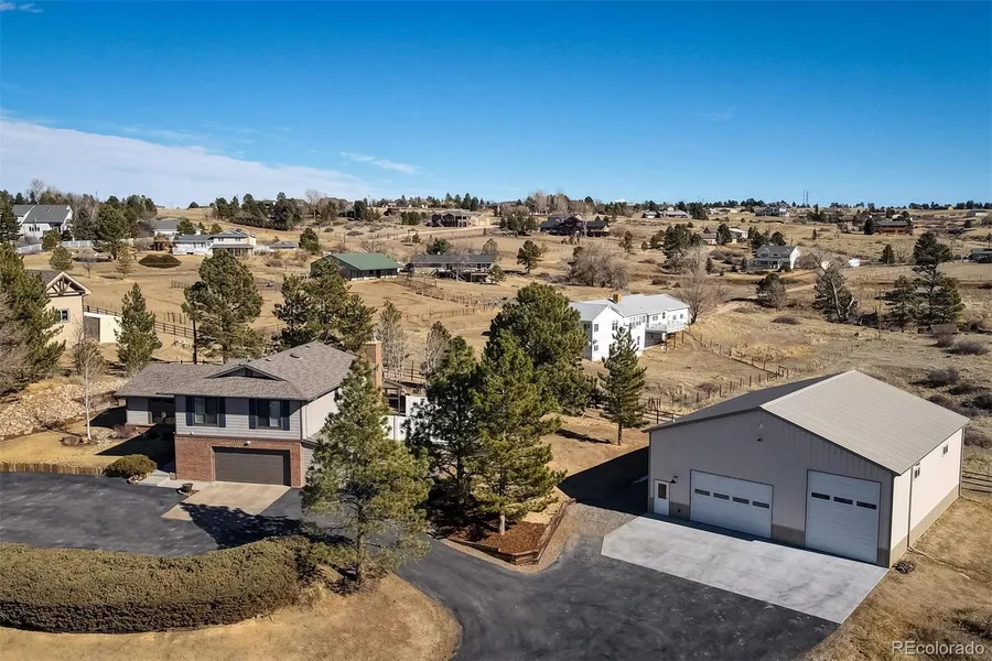 Looking for acreage without the long commute? Look no further! This spectacular updated home sits on a gorgeous 2.38-acre lot on paved roads close to downtown Parker! This property has beautiful mature trees, a brand new fully fenced yard, an incredible new 2250 sq ft (45' wide x50' deep) heated outbuilding with 16' ceiling, concrete floor w/ floor drain, two 50-amp RV hookups and a separate 220V outlet. The home has a welcoming living room with magnificent mountain views, an updated kitchen with slab granite counters, custom subway tile and stainless-steel appliances including a new LG microwave and BOSCH dishwasher. This home is flooded with natural light via skylights in the vaulted family room with dramatic gas log fireplace with tile hearth and a quaint wet bar. The lower level has a spacious laundry/mud area, another bedroom and a 3/4 bathroom with granite counters. There are light tubes in the kitchen and 2 bathrooms as well. Upstairs you'll find a lovely owner's suite with remodeled bathroom and walk-in closet. Two additional bedrooms upstairs share a full updated bathroom and there's plenty of storage in the hall closets too. The basement is partially finished with rec room/office, bonus room in the utility room and a large storage room with access to a crawl space for additional storage. Enjoy peace and quiet from the covered back patio or sunny uncovered area with two gardens. Other features include a new paved circular driveway, convenient storage shed, extra parking on the side of the home and workshop, central air, attic fan, Ring doorbell, radon mitigation system, newly installed carpeting and more! Backs to a neighborhood bridle path!
