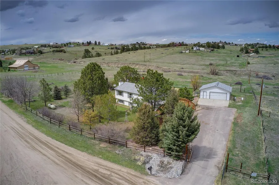 WOW! Enjoy living out of the City Limits and yet not far to either downtown Parker or Southlands Shopping. This terrific horse property features a 4 bed 3 bath home on 5.33 acres with an above ground pool, detached 2-car oversized garage, barn with two horse stalls, shed and chicken coop. A new large deck is perfect to enjoy Colorado living. The open main floor features a workable kitchen with an island, dining room, living room, a master bedroom with bath, two additional bedrooms and a full hall bath. Going to the lower walk-out level you will enjoy the large family room that features IKEA storage and a wood stove, plus the flex room, 4th bedroom/office and 3/4 bath. A mud room provides easy access to the spacious yard and pasture. A few added features are LED lighting throughout the home, boiler heating, there is electrical for a hot tub on the lower patio. You own your own well for ho...