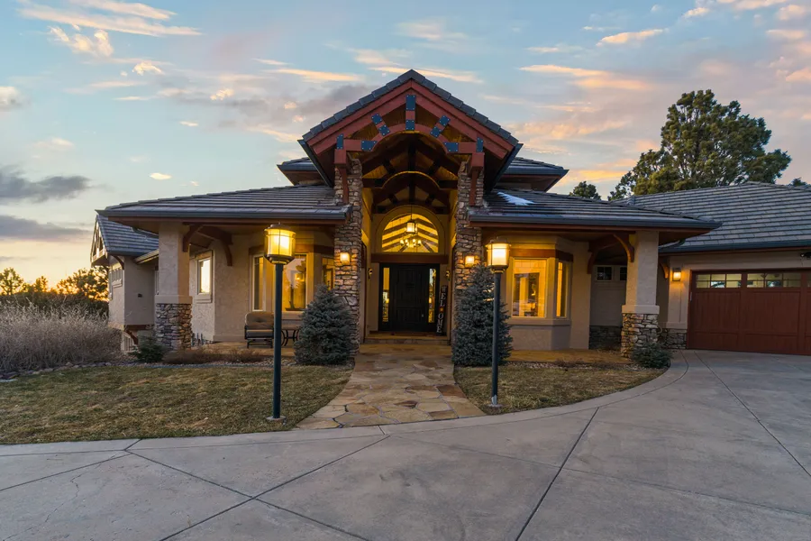 Experience the unparalleled magnificence of Bell Cross Ranch w/ this extraordinary estate! From the moment you arrive you'll be greeted by an awe-inspiring home meticulously designed to embrace its stunning surroundings. Rich wood beam ceilings & expansive floor-to-ceiling windows frame picturesque mtn. views. Indulge in the art of entertainment w/soaring ceilings, open floor plan, 4 majestic fireplaces, & exquisite custom millwork adorning every archway. The heart of the home, a gourmet kitchen, invites gatherings w/ a butler’s pantry, granite countertops, Alder cabinetry & top-of-the-line appliances. A spacious walk-in pantry & a generous eating space surrounding a cozy fireplace ensure comfort for guests. Enrich your work & leisure moments in the study, showcasing your treasured artifacts. Retreat to the primary suite, a true sanctuary boasting a custom walk-in closet, luxurious 5-pc bath feat. a dual head jetted shower & breathtaking mountain views. The main level is complete w/ a bedroom & en-suite bath ½ bath for guests. Descend into the lower-level oasis, where entertainment reaches new heights. A sprawling recreation room awaits, featuring your own theater room w/ 144” screen, premium projector & audio systems, a game room, sophisticated wet bar boasting custom shelving & quartz countertops. The basement includes 2 additional bedrooms w/ en-suite baths. Surround sound envelops every corner, ensuring an immersive experience indoors & out. Set upon 2.97 acres of pristine landscape w/ majestic pine trees, this estate offers the utmost in privacy & natural beauty. Revel in outdoor living on the expansive flagstone patio or the Trex deck creating the perfect backdrop for unforgettable gatherings. Completing this home is a 4-car garage w/ a garage basement equipped w/ electrical, gas & water utilities. Conveniently located near 470 & 20 min. to DTC, this property offers a harmonious blend of luxury, convenience, & serenity.