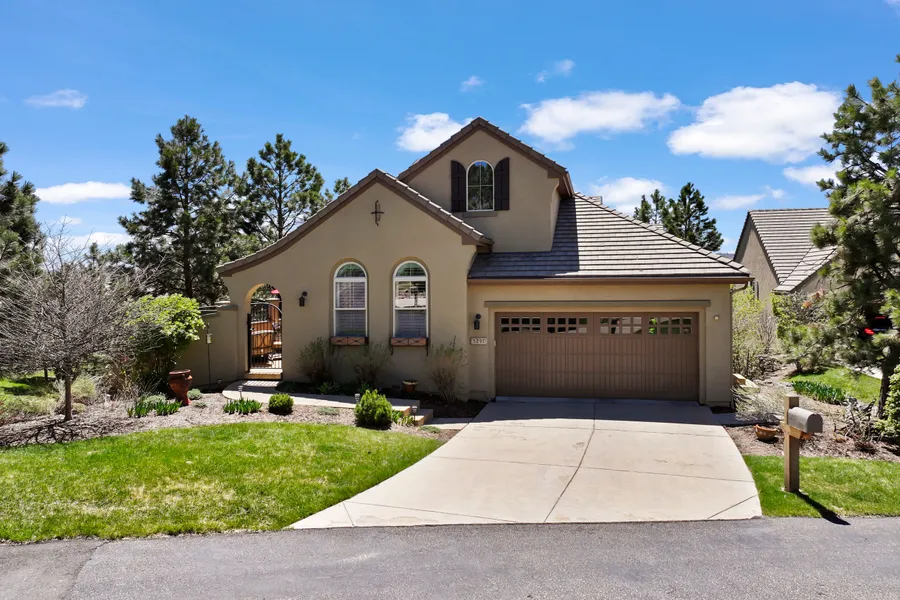 Nestled within the Ponderosa Pines, this patio home in The Village Castle Pines exudes serenity with its low-maintenance exterior and main floor living. Designed for relaxed living, this residence presents a seamless blend of indoor and outdoor spaces, perfect for quiet moments or casual get-togethers. Enter through the spacious front courtyard to find an open floor plan that effortlessly integrates the living, dining, and outdoor areas, fostering an inviting ambiance for gatherings. A tastefully appointed wet bar serves as a convenient focal point between the living and dining spaces, ensuring refreshments are easily accessible. Warm up by the stone gas fireplace in the cozy living room or explore the spacious eat-in kitchen, where sliding glass doors lead to a deck offering sweeping views of the Rocky Mountains, Devil's Head/Sleeping Giant, and Castle Rock's iconic landmark, "The Rock." Designed for practicality and enjoyment, the kitchen boasts ample cabinetry, a generous island, and a layout conducive to culinary endeavors. The main-floor primary bedroom provides a peaceful retreat, featuring expansive windows framing mountain views and direct access to the deck. Delight in the primary bath's amenities, including a jetted tub, bench shower with double heads, and dual sinks. A second bedroom and full bath are conveniently located on the main floor, opposite the Primary for added privacy. Descend to the fully finished walk-out lower level, where entertainment options abound. A custom bar, fashioned from Costa Rican Bullet Wood, divides two expansive open spaces, ideal for various activities. With a full kitchen, charming wine cellar, additional bedroom, and full bathroom, the lower level ensures comfort and enjoyment for all. Completing this residence is a three-car, tandem garage, providing ample parking and storage space.