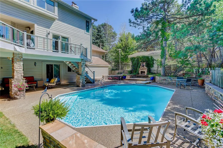 This gorgeously renovated home is perfectly nestled in a quiet cul-de-sac on over of an acre in the highly sought after Pinery Neighborhood. The backyard is an entertainer's paradise featuring a large patio surrounding an expansive, heated pool, a dry below covered patio, hot tub, and a cozy, outdoor gas fireplace. This exceptional property has been meticulously maintained and remodeled boasting high-end finishes throughout. Upon entry, one is greeted with charming, tongue and groove wood ceilings and unique brick floors. Gorgeous Acacia wood floors can be found throughout the rest of the main level adding another touch of elegance. Adjacent to the entry lies the living room featuring a wall of windows, vaulted ceilings, and a stone, wood burning fireplace. The gourmet chef's kitchen is a dream including a stainless, Sub-Zero refrigerator, new double ovens, beverage fridge, double islands, granite counters, and a gas cooktop - perfect for entertaining & preparing gourmet meals. Open to the kitchen are the dining and family room which features a gas burning fireplace for cold Colorado evenings. Exit the main level from the family or dining room to enjoy extended outdoor living on the expansive, composite deck complete with custom wrought iron and glass railings. This is a perfect place for outdoor dining, sharing a beverage, or simply watching swimmers in the pool. Upstairs one will find the primary suite featuring its own private deck overlooking the pool and a beautiful, remodeled bathroom. Two additional bedrooms, another fully updated, spa bath, and loft area can also be found upstairs. Venture to the basement to find an expansive great room complete with a wood burning fireplace, wet bar, plenty of space for a pool table and to add a fourth bedroom. There's also a bath with a large walk-in shower, great for rinsing off after a dip in the pool or hot tub. Step outside from the walk-out basement to enjoy peace and tranquility in your private, backyard oasis.