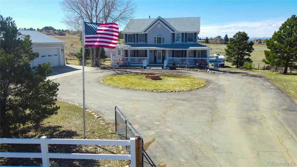 Escape to your own private rolling hills retreat! This stunning 2 story country home, on 7 serene acres, offers unparalleled luxury and breathtaking panoramic mountain views from the back deck and main floor primary. 4 bedrooms and 5 bathrooms, this property is more than just a house; it's a lifestyle. Enjoy the fresh air from the expansive wrap-around porch, perfect for morning coffee or evening relaxation. A paved circle drive leads to both the attached garage (3 car tandem), detached oversize 3 car with heat, and a separate barn, and massive shed adding to the property's practicality and charm. Step inside to discover a grand two-story great room adorned with rich wood floors that exude warmth and sophistication. An abundance of natural light floods the space through large windows, creating an inviting atmosphere throughout the open floor plan. The large kitchen is a chef's dream, featuring abundant storage, a convenient island, and a charming breakfast nook. A cozy den with a fireplace is conveniently located just off the main entry, providing a warm and inviting space to relax. The home offers not one but two luxurious primary bedrooms one conveniently located on the main floor and another upstairs each accompanied by full baths. Convenience abounds with main floor laundry facilities and an impressive, finished walk-out basement equipped with a kitchenette perfect for entertaining or accommodating extended out of town visits. The property's outdoor amenities are equally impressive. A fenced pasture and a barn with a corral provide ample space for horses or other livestock. The extensive upgrades throughout the home ensure effortless modern living combined with the rustic charm of country living in one breathtaking package. Covenants allow for a combined total of up to 5 animals of horses, alpacas, donkeys and 1 beef animal. chickens allowed; no roosters allowed.