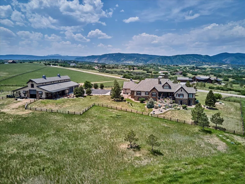 Beautiful Equestrian estate with 360 degree views. Over 15 acres with some water rights & zoned AG. Perfectly manicured, mature landscaping including 7 outside sitting areas with a waterfall & pond. Rare opportunity to live in the gated & friendly community of Bears Den just 12 minutes from I25, Castle Pines Golf Course, & Whole Foods. Spectacular kitchen with Wolf & Subzero appliances, 2 dishwashers, a wine frige, and an oversized walk-in pantry. The perfect floorplan with 5 bedrooms each with its own private bath & walk-in closet. The Main Floor Master suite has its own sitting area with a fireplace, an oversized walk-in closet, & a private deck with Front Range Views. The Master bath includes heated floors, a dual head steam shower, a large linen closet, & an AIR jetted tub. The professionally finished lower level includes a a large entertainment room with a wet bar, projection screen TV, wine closet, game area & music room. There is also a workout room and a stunning in-law or Guest apartment with its own kitchen, separate family room, bedroom & bathroom & door to its own private outside patio. The home includes 2 laundry rooms, a Water Filtration System, 2 Natural Gas generators, 2 AC units, an oversized septic system, whole house vacuum system, a 600 sq. ft concrete, vented storage room & custom window treatments. The 6000 plus sq. ft. detached garage/barn has 4 horse stalls, rubber matting, a wash bay, tack room, hay storage, 4 double automatic waterers, fans & heater. The garage portion of the detached building includes an 8 car garage with drive thru capability, plus 2 lifts (can store up to 10 cars). There is also a workshop area, bathroom, & a pass thru alley for bringing in hay. Barn also has its own large covered porch for entertaining & an outside stone entertainment area. Beautiful, fully fenced land with AMAZING pastures for grazing!