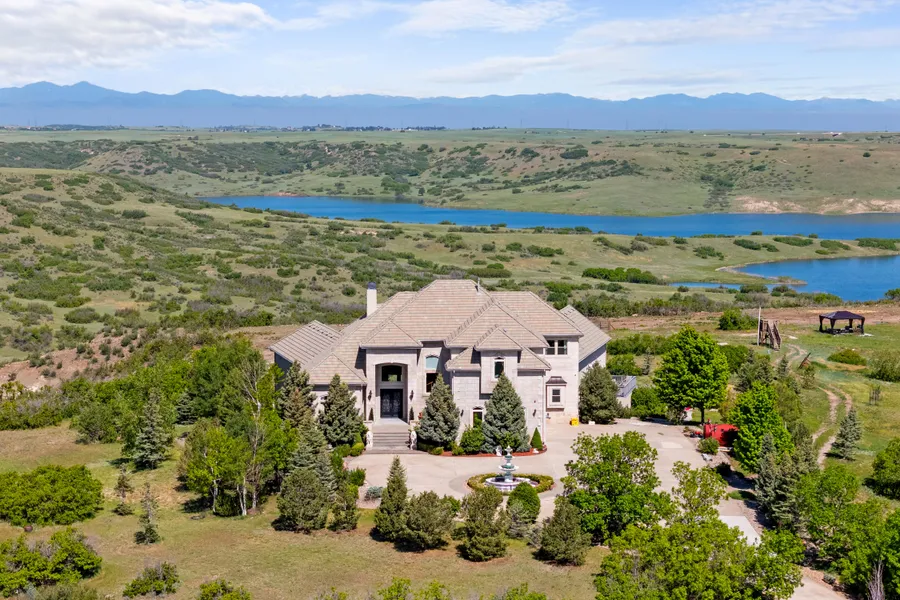Overlooking beautiful blue water and majestic views of the white-capped Rocky Mountains, this estate is crafted with vision, presence, and a deep respect for timeless design. With a sense of grandeur reminiscent of the iconic Biltmore Estatewhere beauty, leisure, and refined living come togetherthis home stands with stately confidence on 26 private acres in a gated community, where neighbors wave and the views roll out like a painted canvas. From nearly every room, youll catch that rare sight: water below and the full sweep of the Front Range above, all the way to Pikes Peak. One of only a few properties with direct access to the Rueter-Hess Reservoir, it offers privacy and natural beauty thats nearly impossible to replicate.