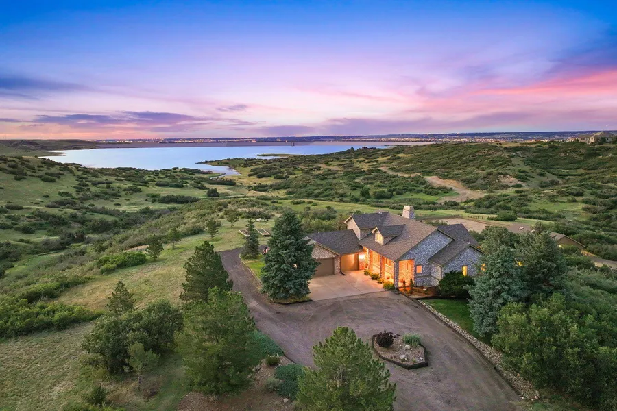 A once-in-a-lifetime setting overlooking and bordering the Rueter-Hess Reservoir with mountain views from Longs Peak to Pikes Peak. Never before offered, this home is just one of four properties that will ever have the privilege of direct hiking access to the lake for boating, paddleboarding, and fishing. Encompassing 17.5 acres, this property is a paradise for horse enthusiasts, featuring a 3-stall barn complete with a heated tack room, laundry facilities, and feed room, plus an expansive 80x180' arena and four pastures. Minutes from Castle Rock or Parker, the gated community ensures privacy and security. If you love mountain views, water, solitude, and wildlife, youve come to the right place! Inside, the traditional-style home is well cared for and tastefully updated. The stunning kitchen offers a large center island, JennAir appliances, and plenty of prep and storage space. Beautiful Australian Cypress hardwood floors span the open living spaces, adding warmth and elegance. A 3-sided fireplace sits between the dining area and the great room, which features a large stained-glass window and a vaulted tongue-and-groove ceiling. The main level includes a spacious primary suite with a beautiful bathroom, an office, plus a den for added space. The upper level includes two bedrooms with newly updated bathrooms and walk-in closets, and one of the bedrooms showcases breathtaking views of the lake. The walk-out lower level is completely redone, with a gorgeous wet bar accented in turquoise granite, two additional bedrooms, a stylish bathroom, and a large unfinished space with an extensive workshop. The naturally weathered river rock exterior smoothly complements the scenic outdoors, surrounded by decks and porches to enjoy the beautiful views. This property promises a life of tranquility and adventure! Make this once-in-a-lifetime property yours for a lifetime.