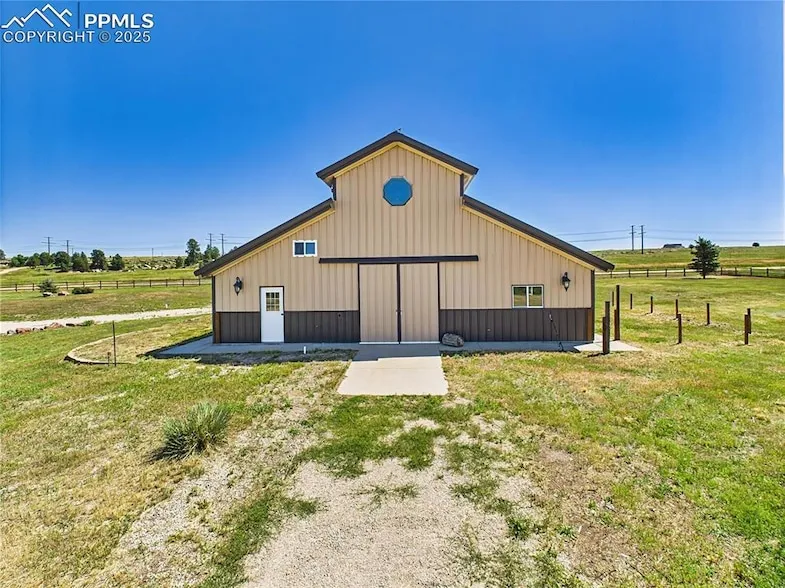 Discover an exceptional opportunity in Palmer Divide Ranches 50 acres of premium land with panoramic Front Range and Pikes Peak views. This rare estate offering includes a 2,880 sq ft steel barn, equipped with 3-phase power, two unfinished offices, 1/2 bathroom and roughed in bath, plus a cozy wood-burning stove and kitchenette, ideal for agricultural use, shop space, or future conversion. Multiple partially finished interior spaces with insulation, plumbing, and drywall in place provide flexible options for further customization. The barn is also supported by two drain fields, including one sized for a future 5,000 sq ft home, and six strategically located outdoor water spigots to deliver excellent irrigation potential. A water line extends to a future pond or swimming area, and the land yields 8,000 10,000 bales of hay annually under its current Ag designation. A total of 4.5 acre-feet of unadjudicated Dawson aquifer rights (3 Upper Dawson, 1.5 Lower Dawson) are included supporting the possibility of an additional well. Wildlife frequent the property thanks to seasonal Cherry Creek running through it, and mature trees and native grasses add natural beauty and privacy. With utilities already in place near a prime build site, and located midway between Denver and Colorado Springs, this property offers unmatched versatility for your custom estate, equestrian operation, or agricultural vision.
