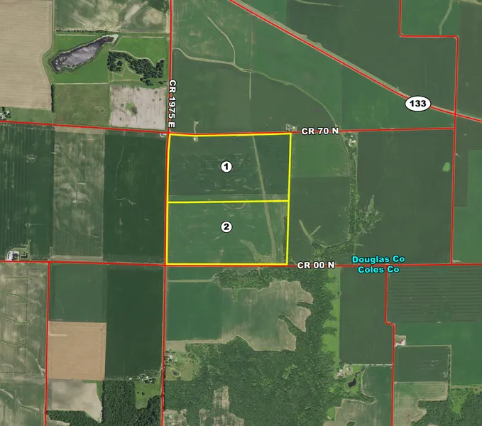 Tract 2: 96 Acres, featuring primary soil types of Drummer silty clay loam and Raub silt loam. Road frontage along County Road 1975E and County Road 00N (Douglas-Coles County line).