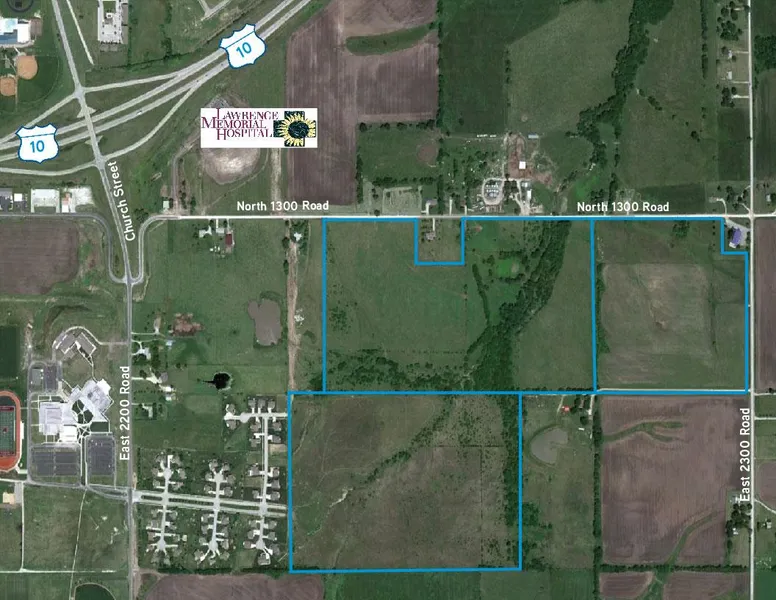 This parcel contains 160 acres of land located within eyesight of K-10 and the Eudora interchange. The parcel has frontage on North 1300 Road and East 2300 Road with access from 23rd Street and 22nd Terrace. The site is a combination of tillable land, grassland, hay land an dsome additioanl tillable possibilities. A prime location for development, the land is near the new Lawrence Memorial Hospital satellite medical office building and Byrnes Pharmacy.