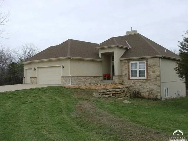 5 wooded acres of beautiful country living on blacktop, only a few minutes to Lawrence/Eudora/Baldwin. 5 BR/3bath/3 car rancher is showcased by an East back wall of windows/custom coverings. Spacious open plan with abundant high-end features/trim level. Master suite has delightful space for office, entertainment or studio. Finished W/O basement has many built-ins/complete wet bar/East window wall. Original owners have maintained nicely.