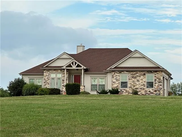 Hard-to-find awesome home on 4.8 acres with Inground Pool - perfect for entertaining! Rare to find 3 Bedrooms on the main level but this home has it, plus space for an office! Owners have meticulously cared for this home and it looks brand new. Kitchen boasts granite counters, stainless appliances, alder cabinets and island. Large master suite features whirlpool tub, double vanity, walk-in shower and huge walk-in closet. Laundry room has sink and is right off the master bedroom. Large Rec Room in walkout lower level features wet bar and wine cellar. Oversized Bedroom 4 is in lower level with a huge walk-in closet. Plenty of storage in this finished basement too. Deck has built-in grill station. Stamped concrete patio walks out to Inground Pool with a motorized cover and fountain. Some of the extras include: James Hardie siding, Weathermate House Wrap, Lifetime Windows, Central Vac, Sound System throughout, Cat5 Wiring, 400 amp service. Propane tank is for the deck grill, great room fireplace and tankless water heater. Otherwise, home is all-electric. This gorgeous home is located approximately 5 miles from the new PANSONIC plant, and is easily accessible to Kansas City and Lawrence. 4th Car garage is at the rear of the home in the basement and is perfect for mower, 4-wheeler, etc. Roof is approximately 6 years old, HVAC and tankless water heater less than 1 year old. Pool boasts new liner. Don't miss out on the fabulous home! Room sizes approximate.