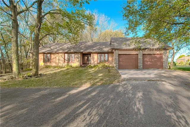 Priced Below Appraisal!! Gorgeous Treed Private setting on almost 2 m/l sprawling acres- rare setting. Features an Open Concept Ranch Home in De Soto Schools located just north on evening star/K10 with great access & 4 approx miles from new Panasonic plant. Large open great room, dining and kitchen areas. Kitchen features granite counters, tiled floors, breakfast bar, oodles of cabinetry and black appliances. Open Areas flanked with hardwood floors, vaulted wood paneling ceilings, and stone fireplace. Large Mud room/Laundry room off rear of kitchen with great storage and sunroom/garage access. Separate formal dining/office room off kitchen gives versatility to the plan for your use. Main level has 3 bedrooms and 2 1/2 bathrooms on main level. Spacious Master bedroom and bath, with private deck access to relax. Large tiled vaulted beamed sunroom that walks out to deck with partial wood fenced area of land. Large basement finished with 4th & 5th non- conforming bedrooms and 3/4 bath, with a very large recreation room with wet bar, and family room. This home needs TLC inside & out, and is priced according, to sell in its present condition. It is a very livable one level living style home with fabulous potential. There are two parcels of land , the land to South is second piece included in this sale to use to your desires. Easily accessible to Kansas City and Lawrence within 15-20 miles. NO HOA!!