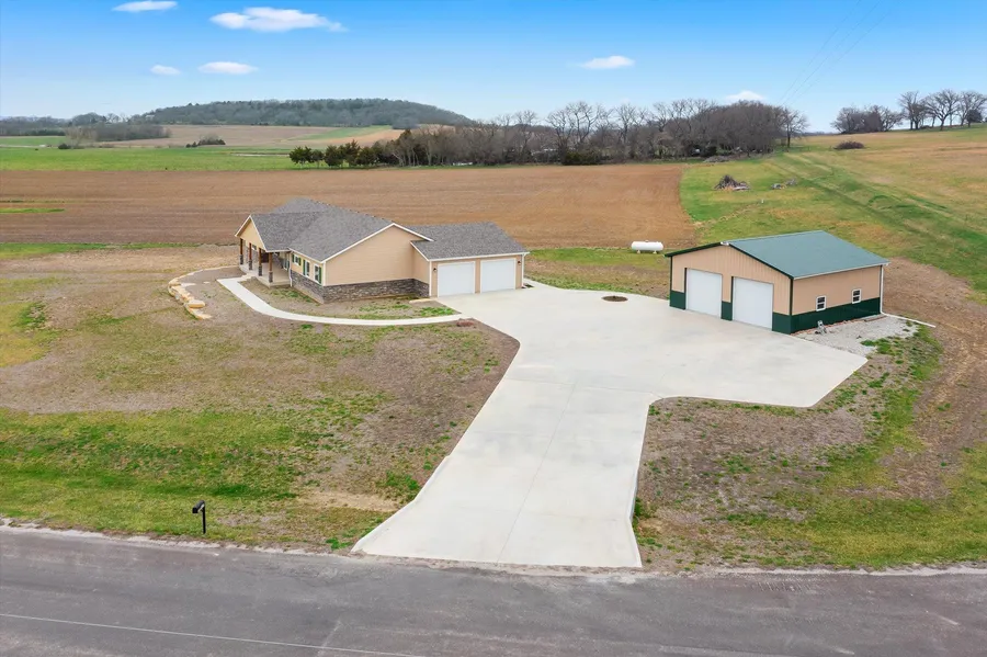 Escape to countryside serenity just 10 minutes southeast of Lawrence! This charming ranch-style home, built in 2023, sits on 13 acres of scenic land with easy access via hard-surfaced roads. Not only is this home ADA compliant, it features 3 bedrooms, 2.5 bathrooms, and a spacious living area. The kitchen is also suited with ample storage, stainless steel appliances, 4-burner gas stove with griddle, and stunning quartz countertops to top it all off not to mention a sizable walk-in pantry. The basement is insulated and ready for sheetrock, including a large safe room. With an oversized 2-car garage and a new 30 ft x 32 ft metal outbuilding, there's ample space for storage and hobbies. Enjoy the peaceful surroundings and modern comforts of this delightful property.