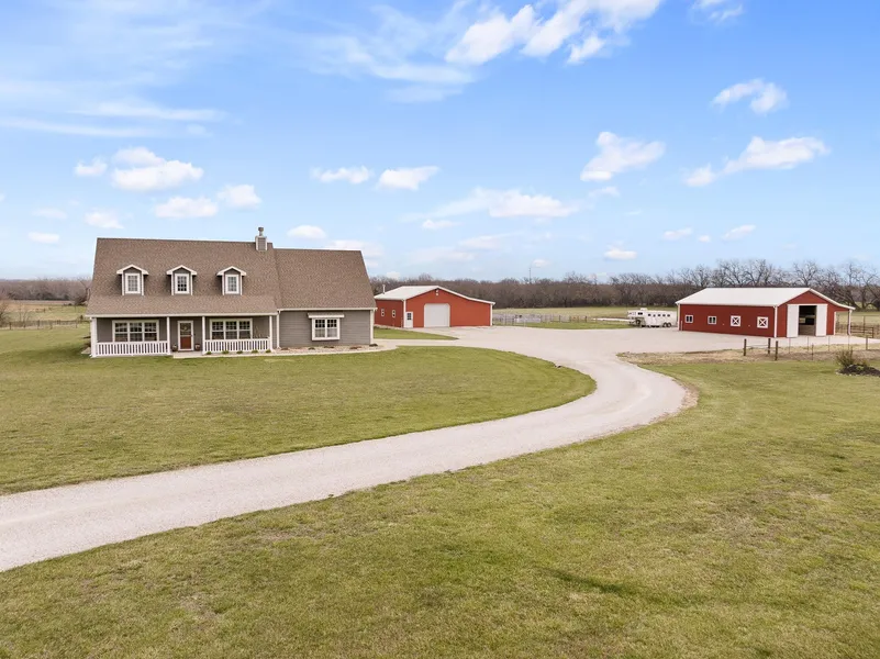 Nestled within 20 acres of beautiful countryside, this picturesque property offers the perfect blend of rural charm and modern convenience. A winding, tree-lined driveway leads you through lush pastures to a recently updated 1.5 story home, oversized shop and new horse barn, making it an ideal retreat for equestrian enthusiasts. The heart of this home is its inviting eat-in kitchen, meticulously designed with large island that seats four, granite counters, pantry and new stainless appliances. Tucked away adjacent to the kitchen, the tiny office nook offers a cozy and secluded workspace. The first-floor features a "safe room" and a spacious primary suite with a spa-like en suite bath. Upstairs you'll find three additional bedrooms, each offering unique charm, full bath and ample linen storage. The long, covered front porch and covered back patio are ideal spots to relax. The meticulous four stall barn is equipped with auto waterers, pipe fence runs off each stall, concrete alley, separate feed and tack rooms, and plenty of hay storage. Insulated shop is equipped with two large overhead doors, providing convenient access for vehicles, trailers, and tractors. Impressive outdoor riding arena, two ponds and easy large trailer turn-around. Don't miss the drone video! Rare property - this one has it all!
