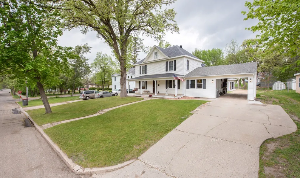 Beautiful original woodwork, hardwood floors, pocket doors, oak stairway and railings, wide crown molding. Currently a 4 bed home could easily be converted to a 6 bedroom home with a wall on the main level. New 28 x 38 heated and insulated garage with steel exterior and interior walls.