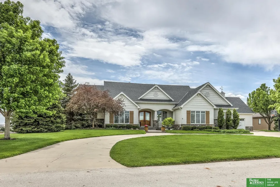 Discover lakefront living at its finest with this stunning 5 bedroom, 5 bath south-facing ranch on West Shores Lake in Waterloo, NE. Enjoy 100 ft of private beach, a cozy fire-pit, outdoor shower, and beach changing area - perfect for unforgettable gatherings. A covered deck with gas hookup, outdoor speakers, and serene lake views sets the scene for entertaining. Inside, enjoy a remodeled kitchen and basement, new appliances, updated fireplace, and luxurious primary suite with new bath, custom closet, and designer finishes. Extras include a 4-car garage with 2 heated plus drain and faucet, beach storage shed, second laundry/flex room, new roof, gutters, grinder pump, and more. Move-in ready coastal elegance.