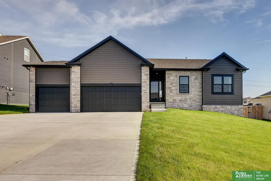 Nearly new Elkhorn ranch with standout style! Eye-catching curb appeal with black garage doors, upgraded black windows, stacked stone accents, & LP SmartSide siding. Oversized 3rd stall features a 4-ft extension and gas line for future heater. Inside, you'll find a modern and airy layout with neutral paint, large windows, and hardwood floors. A 50” electric fireplace with charcoal tile surround and wood mantle anchors the great room. The kitchen impresses with painted cabinets, quartz countertops, gas range with hood, walk-in pantry, and SS appliances. Spacious primary suite offers a tiled shower and large walk-in closet. Hall bath features upgraded flooring & counters. Unique extended front bedroom! Basement is primed for finishing with a bathroom rough-in, upgraded 200-amp panel, and extra ceiling height thanks to bottom chord-bearing trusses—perfect for future living space and bedroom...