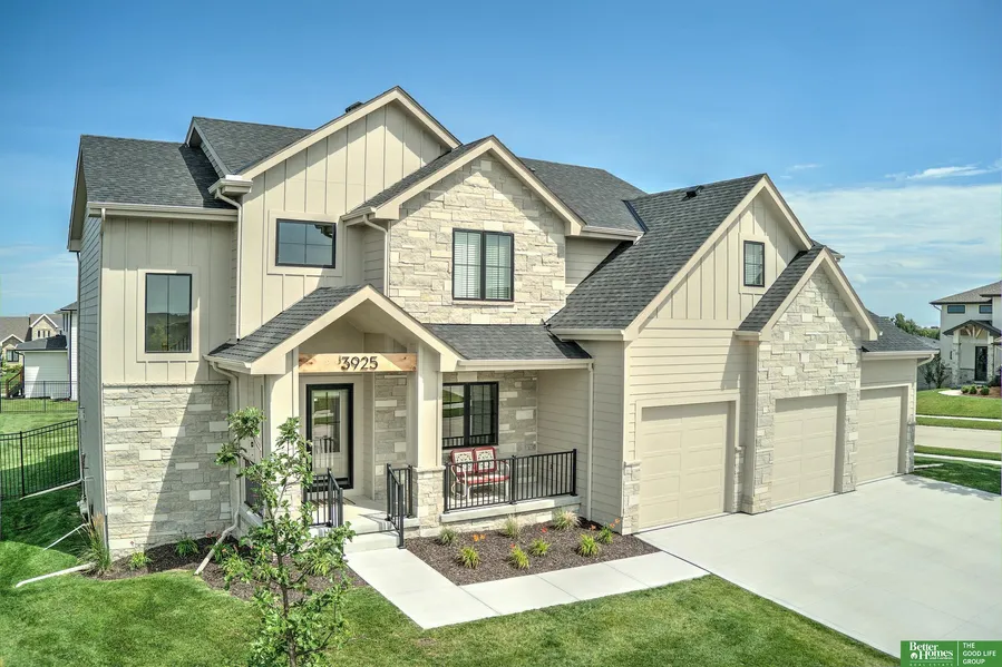 Elkhorn Beauty! NEW Ramm Construction home. Sits up high on a large, west-facing corner lot! 4-5 Bedrooms/4 Baths/3 Car Garage. 2864 finished sq. ft. on first two floors. Basement has 1357 unfinished sq. ft. Beautiful kitchen with locally-crafted cabinets, huge island, and high-end appliances. Eat-in kitchen area, plus a separate dining room with French doors. Lovely, big stone fireplace in the family room. Plus a bonus cozy sunroom with additional fireplace and walk-in closet. Handy drop zone by garage and a huge hidden pantry. Upstairs, the primary suite has a lovely bath with dual vanities, walk-in shower and soaking tub, as well as two huge closets. Spacious jack-and-jill bath between two of the bedrooms. Fourth bedroom has its own bath. Current owners have made many improvements, including: *Brand new big deck on back patio *Brand new iron fence around large backyard *Hunter Douglas blinds *Refrigerator and washer/dryer *Railings on front porch and more!