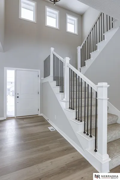 Jim Kristl, M: 402-630-4974, , - The Santa Clara is the largest two story built by The Home Company! 5 beds, 3 bath, 3 car 3173sf. The modern exterior and spacious expanded porch greet you on the drive up, and the full black spindles staircase as your enter shows why this open floor plan fits all your needs! Expanded hidden pantry, vented exhaust hood, a fireplace surround with shelves, a main floor bedroom give your main floor many options for your living space! The second floor bedrooms each have walk-in closets, and all bathroom have Quartz. The Primary Suite boasts a walk-in shower along with a sitting area off of your sleeping area and 2 huge walk-in closets! This stunning home is situated on a flat lot with easy access to a future walking trail entrance. AMA