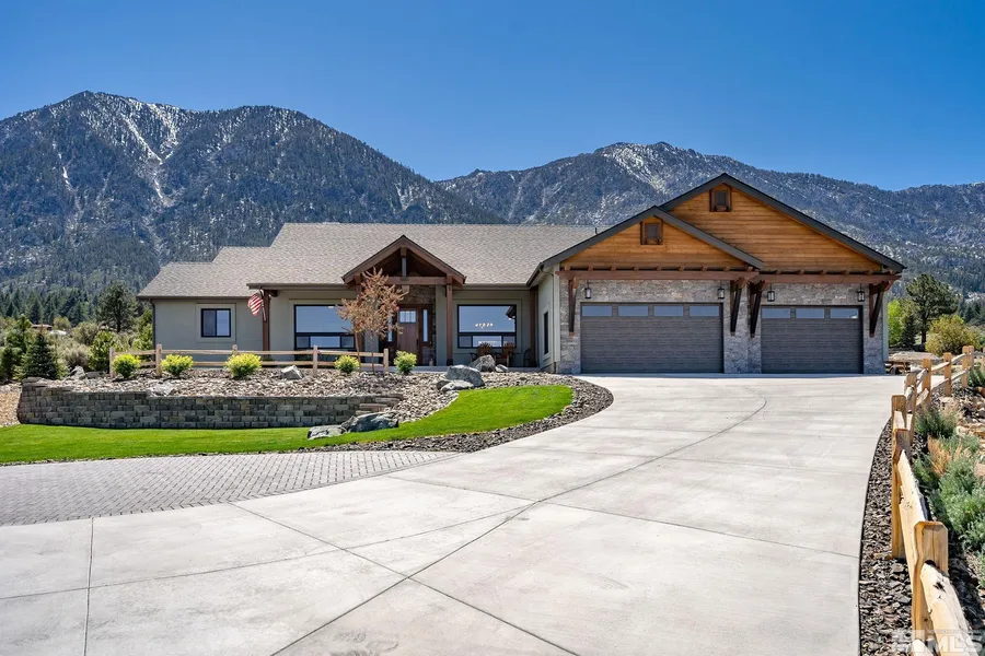 Located at the base of Jobs Peak w/breathtaking scenery of Carson Valley, this custom mountain modern home boasts 5 bedrooms, 3.5 baths & secondary living space. Over 3600 sq of exquisite living. Great room highlights floor to ceiling stone fireplace & exposed wood beam appointments. Gourmet kitchen w/waterfall island & alder wood cabinets. Master features walkthrough shower, heated flooring & soaking tub. Sweeping mountain views & pristine landscaping. Minutes to Lake Tahoe, Heavenly & Kirkwood ski resorts