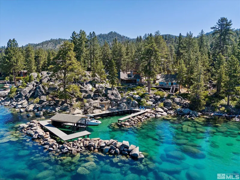 Lake Tahoe. This remarkable estate offers 230 feet of pristine lake frontage, complete with an expansive pier cradled within an electronic boat lift, dual piers, two permitted buoys with protective breakwater jetties. Hidden Harbor estate boasts generous allowable (TRPA) coverage estimated at 38,747 square feet total, including 5,781 sq. ft. not being used! Showings upon appointment only. 24 hours minimum notice. Proof of funds is required. No agent previews. Listing agent will accompany all showings. The possibilities are endless! The "Old Tahoe" style is beautifully preserved in the five fully renovated and furnished cozy cabins, each offering direct waterfront access and breathtaking lake views. Outdoor enthusiasts will revel in the endless opportunities for recreation and entertainment. The expansive wrap-around pier provides over 1,900 square feet of decking, perfect for hosting gatherings or enjoying serene sunsets over the lake. Hidden Harbor draws water directly from Lake Tahoe for domestic use, supported by deeded water rights, ensuring a sustainable and self-sufficient lifestyle. Hidden Harbor is a rare gem on Lake Tahoe’s Nevada side, offering both seclusion and convenience. Don’t miss this unique opportunity to own a piece of Tahoe’s heritage, with endless potential for personal enjoyment or future development. Explore the possibilities at Hidden Harbor – your private lakeside paradise awaits. Property Highlights: Lake frontage: 230 feet of stunning shoreline with southwest exposure with a sandy bottom cove. Amenities: Two permitted buoys, expansive pier, rebuilt boathouse with internal boat lift, extensive lakefront decking, sandy-bottom harbor with deeded water rights. Douglas County Assessor recognizes six units (five cabins currently). The five well-equipped cabins have full kitchens, luxurious heated floor bathrooms, laundry facilities, Fireplaces, designer furnishings, and spacious decks with gorgeous lake and mountain views. Development Potential: Endless-Ideal for future expansion or enhancement; Has an additional TRPA development right with 5,781 feet of additional land coverage. Gated entrance at Highway 50 with 200 feet of Highway 50 frontage. Location is just five miles to the Heavenly Valley Gondola, Edgewood Golf course, Tahoe Blue Event Center, Stateline Casino/Entertainment corridor, and less than two miles to four local public beach facilities. The property is located .5 miles from Zephyr Cove Resort and less than 45 minutes to Reno International Airport