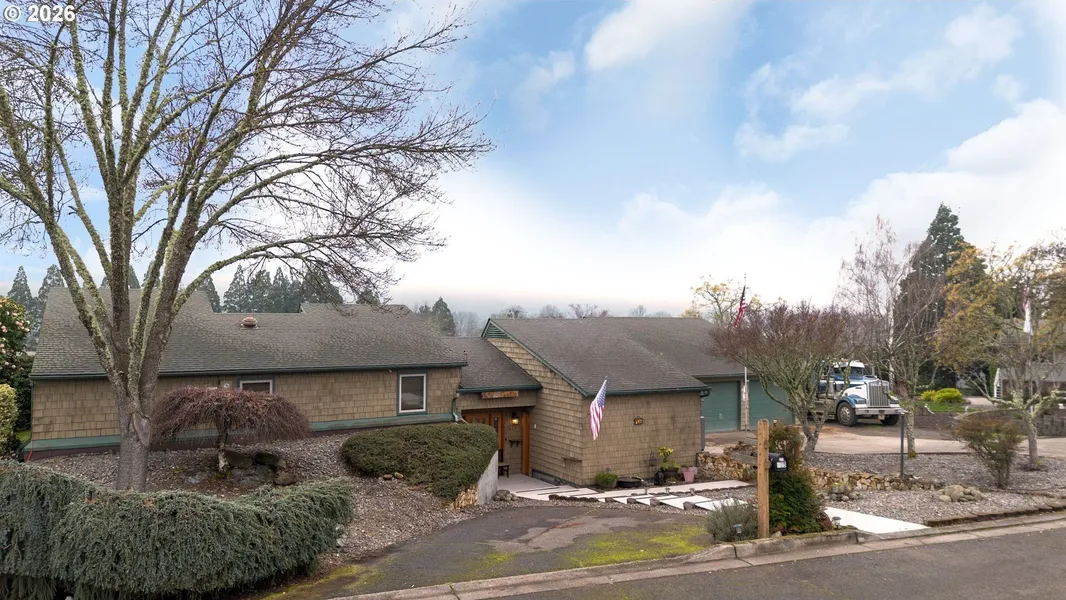 This custom-built Passive Solar home, constructed in 1979, offers a rare blend of timeless beauty, retro charm, and thoughtful modern updates. This Passive Solar home is thoughtfully designed to work with the sun and climate, providing comfort, efficiency, and sustainability without relying heavily on mechanical systems. Ideally located near local river recreation and just a short drive to the Oregon Coast, the property enjoys a larger than average lot with mountain views and a front-row seat to the community's annual fireworks display. The multi-level design creates a distinctive contemporary living experience, featuring three bedrooms, two bathrooms, a living room, family room, and flex space which can be used for an office, yoga studio, craft room, etc. The family room showcases a dramatic two-story ceiling with a custom brick wall that reflects the home's architectural era, while the living room is anchored by a cozy gas fireplace. The spacious kitchen includes built-in appliances, a peninsula, and an eating bar, making it both functional and inviting. The main bathroom which served all bedrooms on the upper level is updated with warm wood finishes and new glass shower doors. Main and Lower levels walk out to the rear entertaining space. Recent improvements include new laminate flooring throughout, a new furnace and heat pump, and a 40-year roof replaced in 2001. Additional highlights include newer vinyl and wood windows, an oversized detached two-car garage with workshop and separate driveway, a greenhouse, shed, hot tub included in the sale, and an updated fenced yard. The expansive rear yard is ideal for entertaining, providing privacy, space, and versatility in a truly special setting, ready for your imagination. Schedule your private tour today.