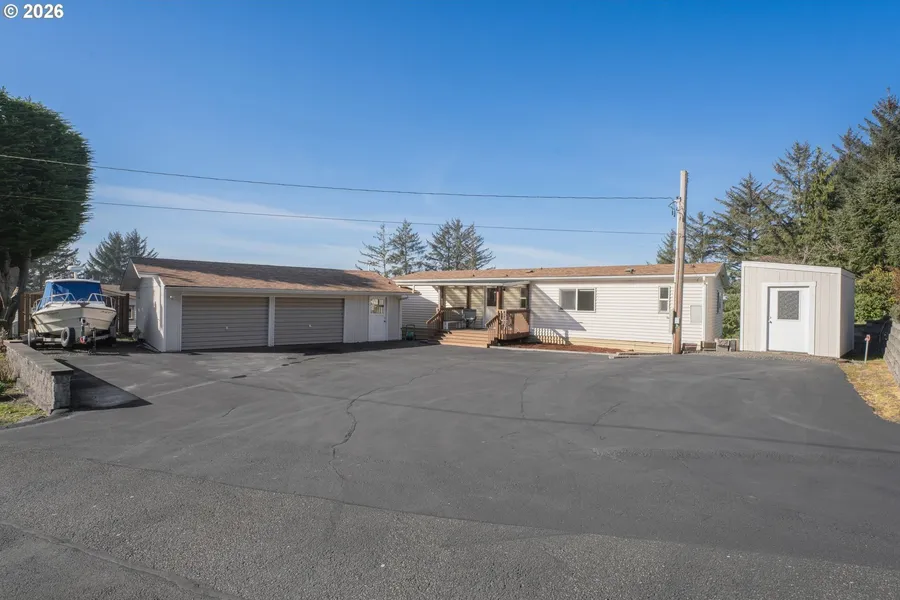 This residence offers expansive views of the Umpqua River, Pacific Ocean, and Winchester Bay's Salmon Harbor from its elevated hilltop position. Situated down the street from the National Dunes Recreational Area, it is an ideal location for enthusiasts of outdoor activities. Residents can appreciate stunning sunsets and picturesque ocean and river vistas directly from the living area. A 120 sq. ft. deck at the front of the property is well-suited for barbecues, relaxation, and enjoying sunshine. An open concept floor plan enables seamless entertainment while maximizing enjoyment of scenic views and sunsets. The primary bedroom includes an ensuite bathroom, generous closet space, abundant natural light, and water views. The property is meticulously maintained, reflecting a high standard of ownership. With a total area of 1,248 sq. ft., this two-bedroom, two-bathroom home is positioned on a tranquil private road. The 896 sq. ft. garage is equipped with a workshop and a canning kitchen. Additional parking adjacent to the garage accommodates boats or recreational vehicles. The paved driveway ensures easy maintenance, and a garden shed provides ample storage for gardening tools and barbecue equipment. Extensive terracing facilitates flower gardens and straightforward outdoor upkeep. This property serves as an excellent base for a variety of recreational pursuits along the Oregon Coast. As the property is located on a private road, drive bys are not possible. Make an appointment to see this one of a kind property today!
