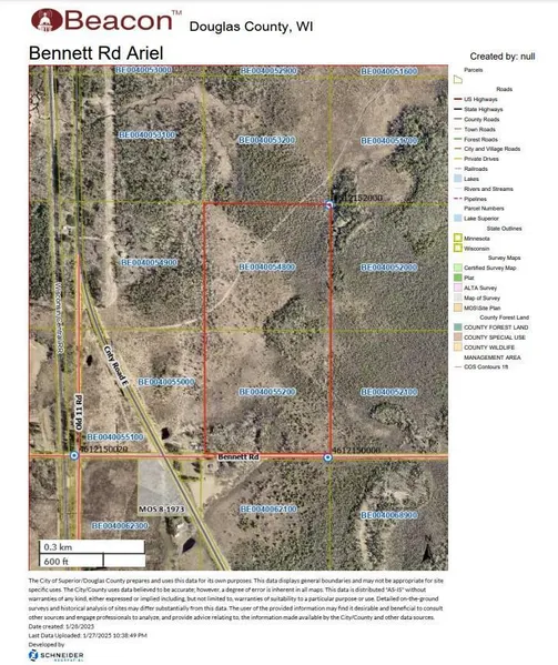 Discover 80 acres in Douglas County, just outside Solon Springs. This property along Bennet Road offers a potential building site among established homes, making it perfect for your dream residences or recreational retreat. The property's diverse landscape includes mostly level ground with subtle elevation changes, offering versatility for various uses and creating an ideal setting for wildlife and hunting. Located near Solon Springs' extensive trail systems, enjoy year-round outdoor activities including: *Hiking and snowshoeing * Cross-country skiing *Snowmobiling * ATV/UTV riding This parcel combines the perfect balance of accessibility and natural beauty. Whether you're seeking a private hunting ground, recreational paradise, or future homesite, this property presents a rare opportunity to own a significant piece of land.