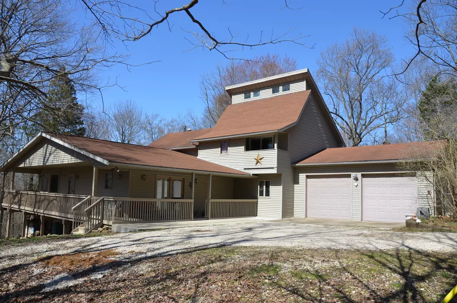 FOLLOW THE WINDING LANE through the woods along side a pond to your 4 bedroom 3 1/2 bath secluded home on 29.5 wooded acres. This home will exceed your expectations with its oak trim, doors, and cabinets. The spacious living areas give this contemporary home a sense of casual elegance and is ideal for today's active family lifestyle. The over-sized living and dining areas are framed with windows and accented with a large central custom built stone fireplace to lend its glow to both areas as well as provides a wonderful place to celebrate special occasions. The remodeled equipped kitchen features a 5-burner gas range top, double wall oven, has easy access to the formal dining area, and leads to an attached 2-car garage. The wrap covered deck provides appeal and provides plenty of outside living. The main level master bedroom offers his/hers closets, shower stall, deck access, plus a secon...