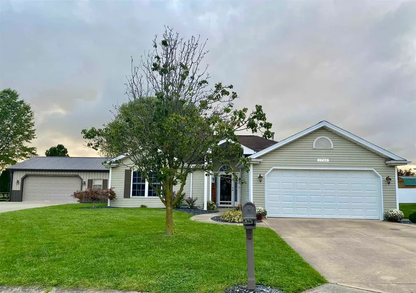 Clean, ready to move into home located in Huntingburg. This one story home features split 3 bedrooms, 2 bathrooms, 2 car attached AND 2 car detached garage. The detached oversized garage is insulated with finished walls, concrete floor and driveway and has added storage above. The front door opens into a spacious foyer which leads into the family room with a cathedral ceiling. Home is in impeccable condition!! Master bedroom suite is spacious with a large attached bathroom. The covered patio is waiting for you to enjoy the fall evenings!!