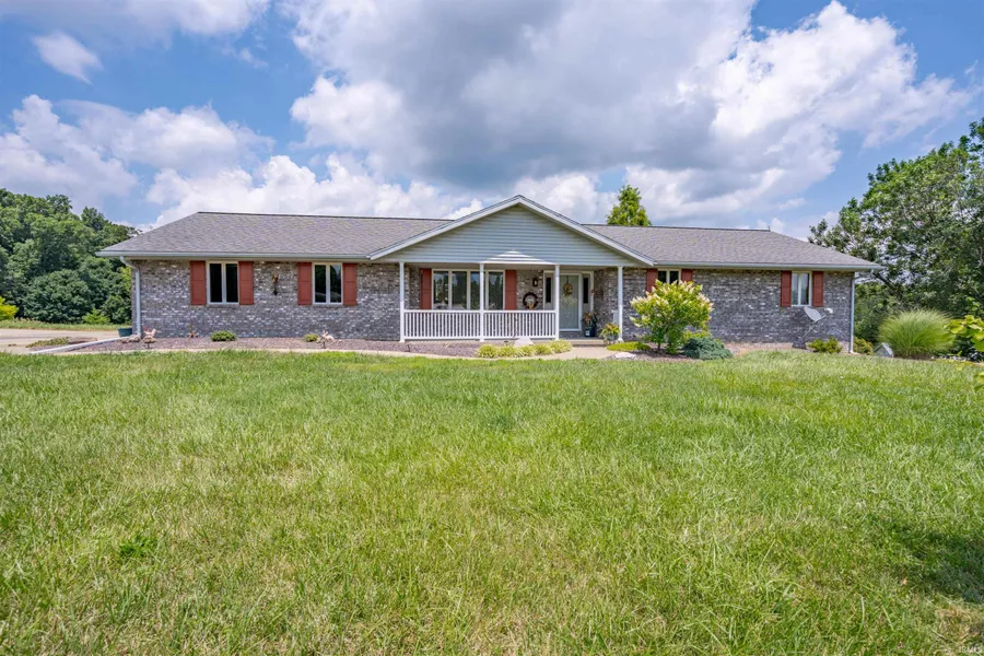 Don't miss this 3 bedroom/2 bath ranch with full basement that has impeccable character and has been meticulously cared for sitting on 5.29 acres with lake and detached garage near Patoka Lake. The attractive curb appeal draws you right in to witness a remodeled open concept living space, designer kitchen w/quartz countertops and dining room with a soothing palette. The modern wood floors, newer appliances and updated master bathroom add to the cohesive new look. The utility room and second bath are immediately as you enter thru the newly renovated garage. The other wing offers a master bedroom with entrance to the bathroom and sizable walk-in closet. The hallway entrance to the bathroom provides convenience for the other two bedrooms. Venture to the partially finished basement featuring a family room with electric fireplace and rec area leading to a storage room housing the newer geothermal heating/air system. The showcased 5 acres with lake draws you right out to enjoy from the vinyl deck off the dining room or the walkout basement patio or enjoy relaxing with the view off the covered porch of the detached garage or from your very own beach. Take advantage of the garage/work shop for all your awaiting adventures at Patoka Lake (natural state park). Stay in the comforts of this beautiful home and relax or enjoy what the surrounding small, quaint towns have to offer!
