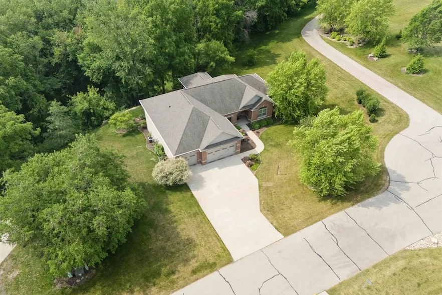 Tucked away on over an acre of wooded privacy on a cul-de-sac lot, this is one of those rare homes that checks all the boxes. This custom walk-out ranch offers 5 bedrooms, 4 bathrooms, and over 3,470 finished sq ft of living space. Built in 2014, the home welcomes you with rich hardwood floors, tray ceilings, and tons of natural light. The open-concept main floor features a beautiful kitchen with granite countertops, rich cabinetry, tile floors, and a walk-in pantry. Right off the kitchen is a spacious living room with a gas fireplace and large windows overlooking the backyard. The main level also includes a generous primary suite with a tiled shower and his and hers walk-in closets, two more bedrooms, 1.5 baths, and a laundry room. Downstairs you will find a large family room, two additional bedrooms, a full bath, and walk-out access to the backyard. Lower level also includes ample storage space and a garden garage. All of this in a quiet Dubuque neighborhood, just minutes from schools, parks, and shopping.