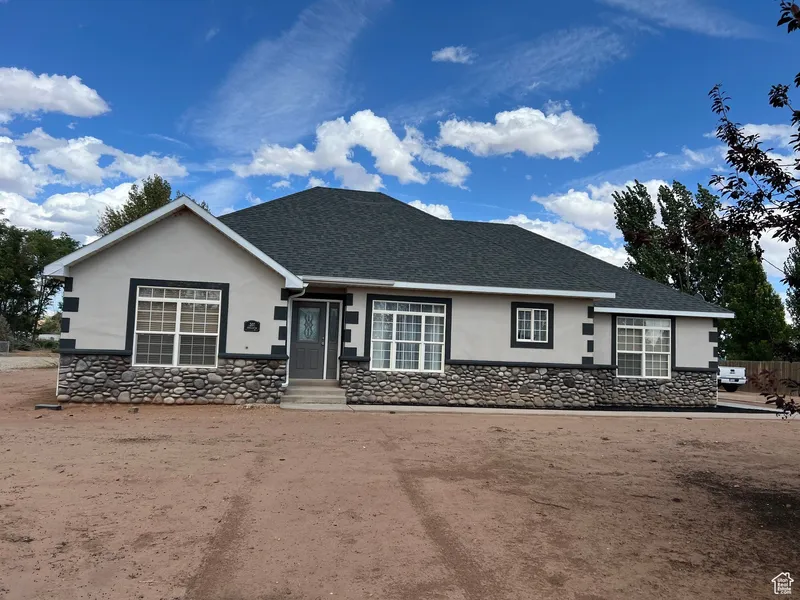 Beautiful 4-bedroom, 2-bath rambler on 1.32 acres in the quiet Stonegate neighborhood of Roosevelt! Built in 2005, this 1,871 sq ft home offers single-level living with a spacious open layout and large living room and dining space. The kitchen includes a range, refrigerator, microwave, built-in dishwasher, and dining space, with easy access to a patio for outdoor entertaining. The primary suite features a walk-in closet, jetted tub, and separate tile shower. Additional highlights include 1 water share ($150/Year) vaulted ceilings, hardwood and tile flooring, double-pane windows, central air, propane forced-air heat, and electric dryer hookup. Paint your own blank canvas with a yard that you can craft to your liking. The 2-car attached garage provides storage, plus RV parking for all your toys. Outside, enjoy mature trees and mountain views-all on a flat, usable lot ideal for animals or a...
