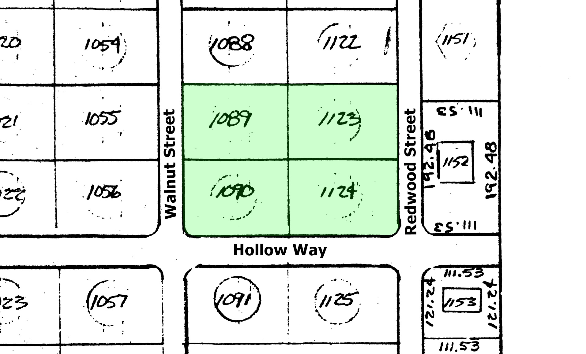 This group of four adjoining 0.5 acre lots can be combined to make a massive property of approximately 2 acres. This creates a nice corner property and has 243.74 feet of frontage on Walnut Street, a good dirt road, on its west side, and 243.74 feet of frontage on platted Redwood Street on its east side. Also there is 357.42 feet of frontage on platted Hollow Way on its south side. Electric lines run along Hollow Way along the southern edge of the lots.