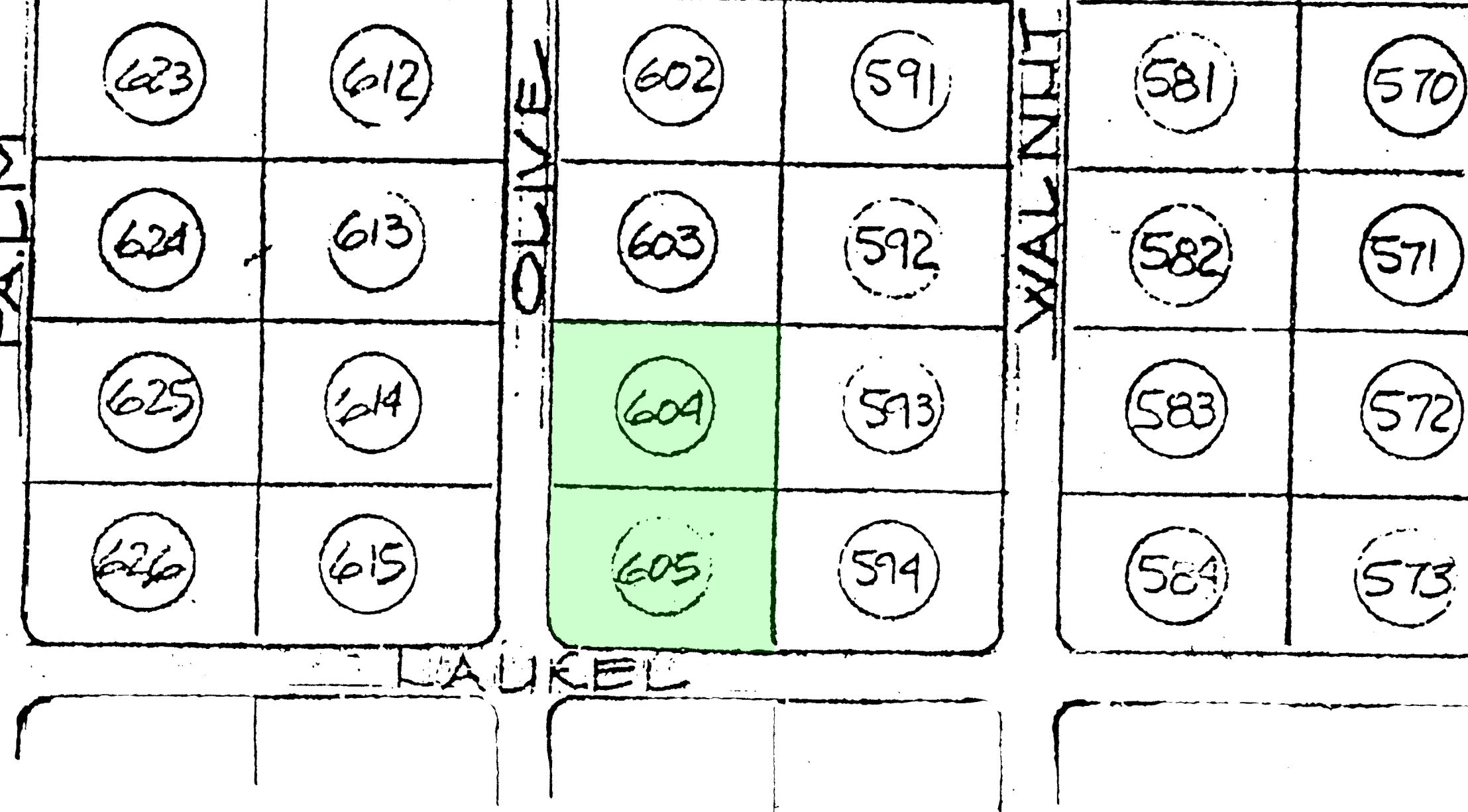 Lot 605 is at the intersection of platted Olive Street and Laurel Drive. Lau...
