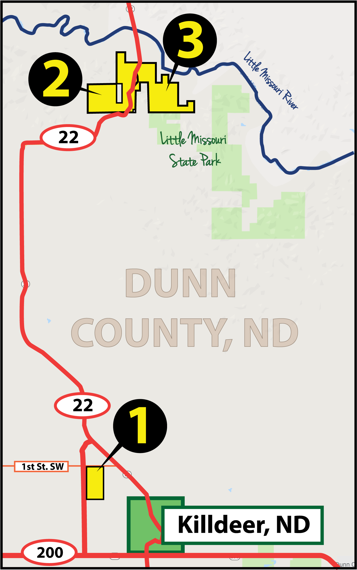 The Fettig Ranch will be offered in three parcels. Parcel one features a notable farm and ranch headquarters highlighted by a multi-purpose building with living quarters, shop, tack room, livestock well and Southwest Water (Rural Water.) The highly productive cropland is suitable for alfalfa and small grains, and the pastureland offers excellent grazing. The Gumbo Creek also runs through this parcel. North Dakota Hwy. #22 divides parcels two and three which provides great access to both parcels.