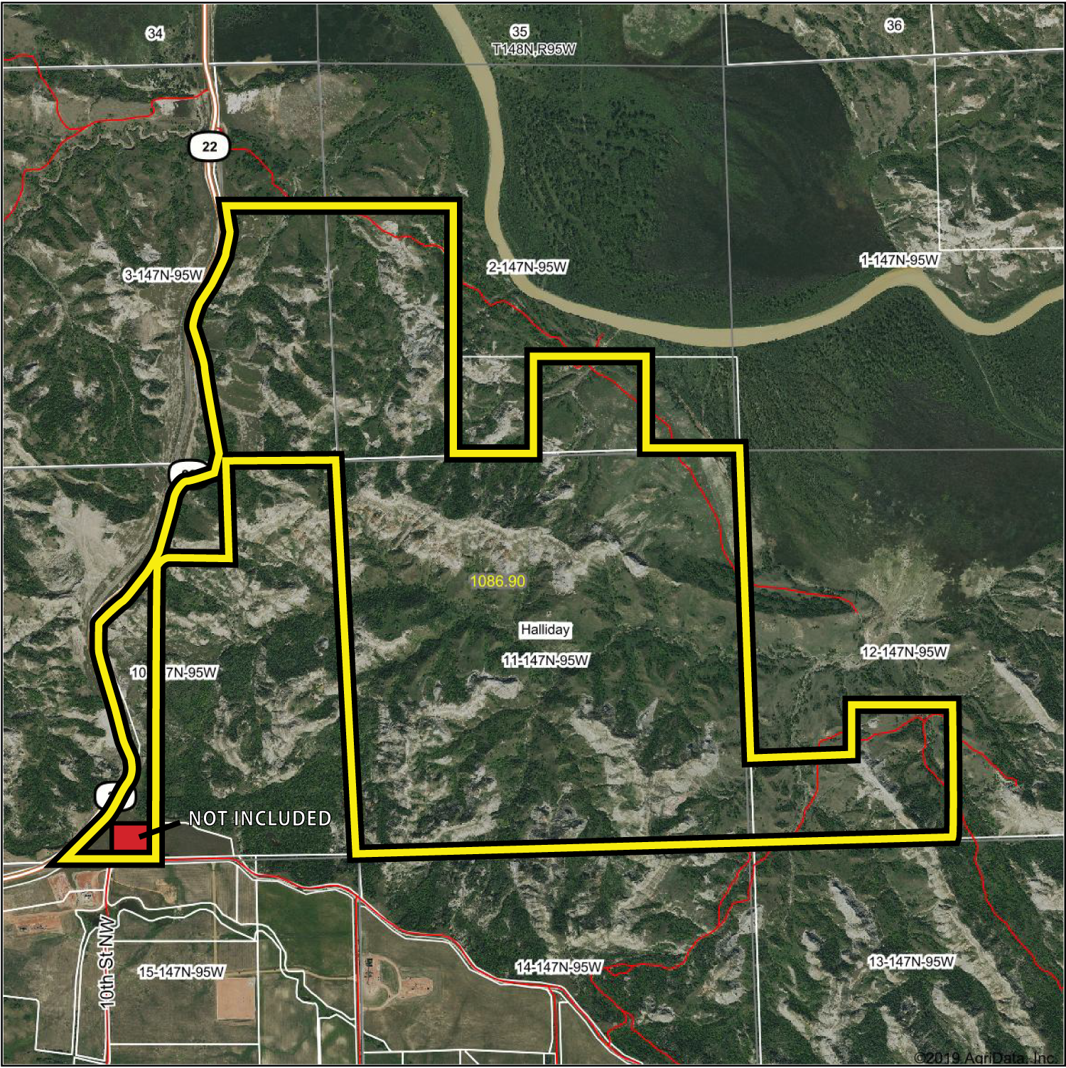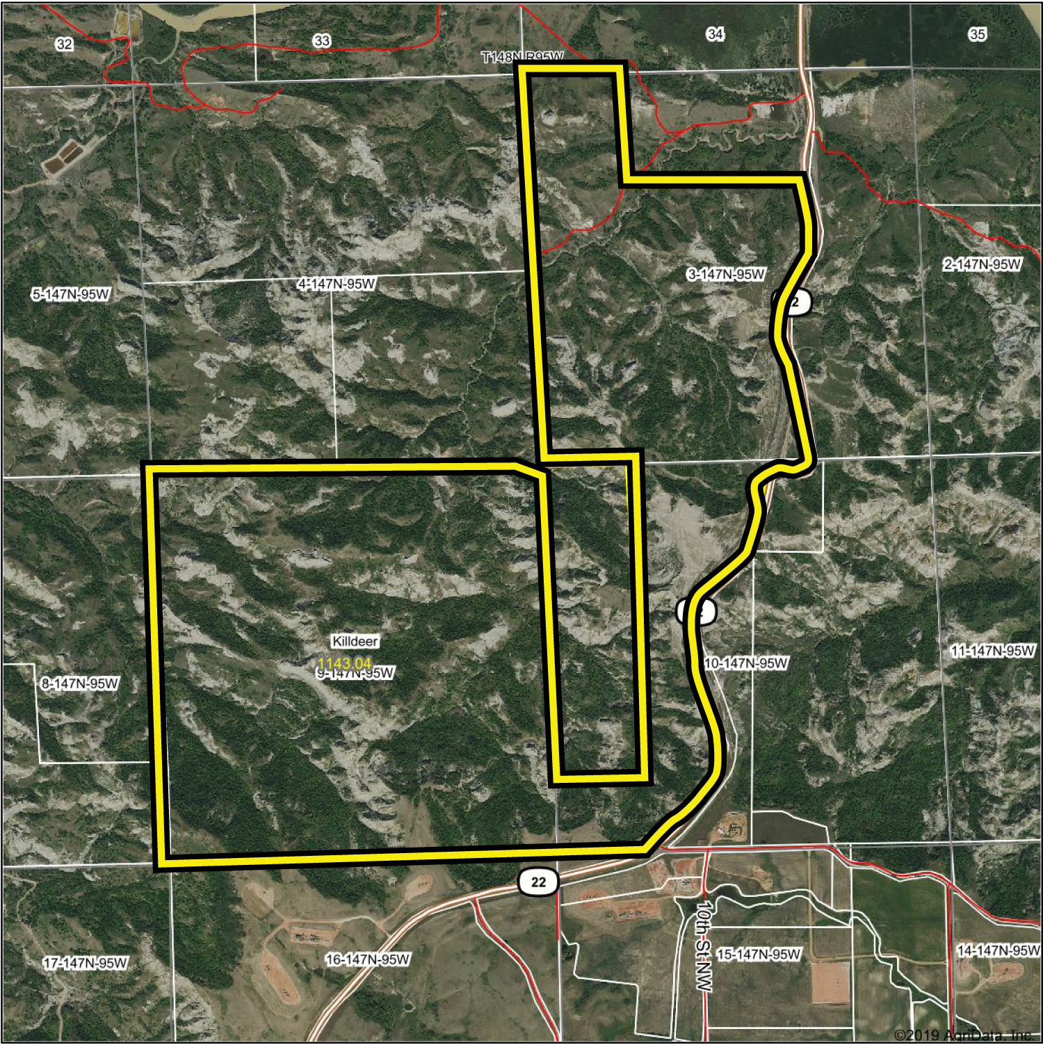 The impressive steep tree-lined valleys, and massive buttes provide remarkable habitat for wildlife. Recreational opportunities are endless, such as hiking, horseback riding and hunting! The native grasses and access to Southwest Water (Rural Water) provide a powerful dynamic for livestock grazing. This parcel clearly has much to offer, including excellent access from ND Hwy. #22. The entire access lies west of Hwy. #22.