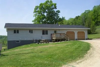 106 acres w/ 3 bedroom, 2 bath ranch built in 2000, home features an open design w/oak cabinets w/ island, lg eat in kitchen. Out bldgs include barn formerly dairy now used for beef, older poleshed, shop building, land consists of rolling farm fields, woods, pasture, pond and springs, valleys and hills. The home site is set down in the valley, very private. peace and serinity here.