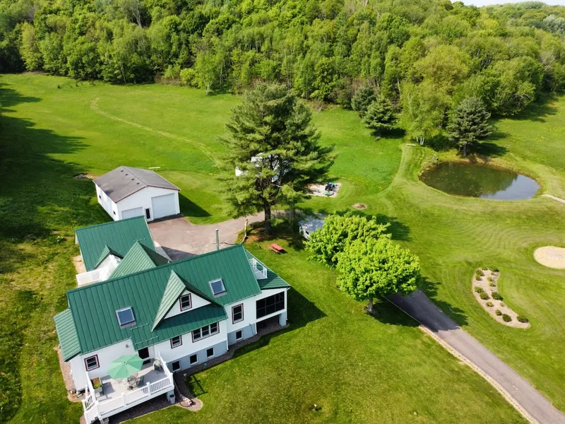 This modern farmhouse is a 3400 square foot masterpiece of architecture situated on 58 ac of pristine land. Located in an very coveted area of Northern Dunn County, the estate sits as the back end of a beautiful valley surrounded by hardwood ridges. The home has 2 bedrooms, 2 full bath and 2 half baths. The owners used two other rooms as home offices but designed them so you can easily add a closet if you wanted to convert them to bedrooms. The design of the home is very efficient with geothermal heat and insulated concrete forms in the foundation. There is a two car garage connected by a vestibule that doubles as a green house. Outside you will find plenty of storage for machinery in the pole barn or three sided shed. The grounds are some of the most beautiful woods and fields I have seen in Dunn County. Once certified as organic, the owners had a pumpkin seed oil business and grew copious pumpkins each summer. There are perennial flower beds planted with thousands of bulbs ready to burst to life this spring. A really unique feature is an artesian well that springs forth from the hillside providing the purest drinking water mother nature has to offer. If you are looking for a beautiful custom home in Western Wisconsin within a commuting distance to the Menomonie/Eau Claire area please schedule a showing with Land Specialist Neil A. Hauger today.