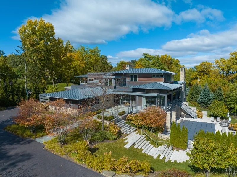 Behind the gates of sought-after Hunter Trails, on a private cul-de-sac, and down a long herringbone drive, an architectural wonder awaits. Wood, stone, glass, and steel converge with a whisper of Frank Lloyd Wright inspiration and a vast expanse of modern luxury in this remarkable estate. The home spans almost 10,000 square feet - encompassing five bedrooms, six full baths, three powder rooms and incredible light, flow, and detailing on a verdant, entertainer-perfect, one-acre lot with a pool and so much more! The front door, with its abstract glass-paneled design, sets the tone for the artistic expression found throughout the interior, with rich hardwood floors and elegant designer lighting providing further extravagance. A similarly fashioned, sculptural carved wood panel garners attention above a fireplace in the formal dining room, while also shielding the staircase from view during meals. This wondrous space also enjoys beautiful views of lush foliage through floor-to-ceiling windows - a common theme throughout the home. The adjacent formal living room expresses its connection with nature through massive windows on three sides, including an entire wall of glass that beautifully frames out the trees. The open floorplan creates exceptional flow, starting with the enormous gourmet kitchen, with its Quartzite slabs and warm wood cabinets, professional high-end appliances, and incredible triple-width hood - another double-duty detail that looks like art while providing valuable function. Move freely into the breakfast nook and family room beyond to find each is warmed by its own fireplace, the family room's clad in stone. Walls of windows invite the outdoors in and direct access is offered to one of the property's multiple decks. This level also has a large private bedroom suite and two flexible spaces that are ready to be transformed to meet your family's unique needs. Upstairs, the bedroom level houses the luxurious primary suite with three walk-in closets and a spa bath, two additional ensuite bedrooms suite with walk-in closets, more flexible space, and a convenient laundry room. The lower level claims incredible space for fun and entertaining, with a large recreation room with wet bar, a media room, a mirrored exercise room facing out to the pool, and a tasting room with a view into the magnificent wine cellar. Valuable guest space is created with a large ensuite bedroom, a powder room and additional finished and unfinished space offers even more flexibility. Another full bath off the pool with steam shower and washer and dryer leaves no detail overlooked. Walk right out from the recreation room to the pool, spa, covered patio, huge grassy area, and mature trees and take it all in. With so many amenities both inside and out, it may be hard to leave. But the idyllic location puts you within easy reach of Oak Brook Park District, restaurants and shopping, transportation corridors, and award-winning schools. Don't miss the opportunity to turn the ultimate dream home into your forever home!