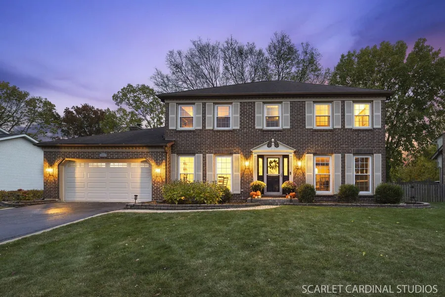 Gorgeous brick-front Georgian home offering 4 bedrooms, 2.1 baths, and a finished basement nestled in a cul-de-sac within School District 203. The main level features a formal dining room and a bright living room with access to a private office, perfect for working from home. The spacious kitchen includes granite countertops, abundant cabinetry, hardwood flooring, black and stainless steel appliances, a pantry closet, a planning desk and an adjacent eating area. The inviting family room showcases a beamed ceiling, masonry fireplace flanked by built-in bookshelves, and sliding glass doors leading to the sunroom. The sunroom's vaulted, beamed ceiling and wood-burning stove add warmth and rustic charm. A powder room and laundry room complete the first floor. Upstairs, the primary suite offers a walk-in closet and private bath that features a dual vanity, tile flooring and a standing shower. Bedrooms 2, 3, and 4 are generously sized with large closets and share a full hall bath. The finished basement extends your living space with a large recreation room, a second family room, a game room, and an exercise room. Currently used for storage, there is also a rough-in for a future bath. Enjoy outdoor living in the fenced backyard featuring a stamped concrete patio and plenty of greenspace for play or gardening. Ideally located near Naperville Country Club, the brand new Heinen's Grocery Store, Prairie Elementary, Benedictine College, and a variety of shopping and dining options along E Chicago Ave, Maple Ave, Naper Blvd, and also minutes away from Downtown Naperville. This home truly checks all the boxes!